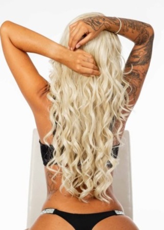 | Haare: | blond, rückenlang, wellig |