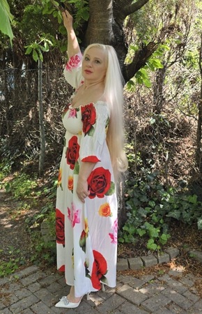 Haare:blond, rückenlang, wellig