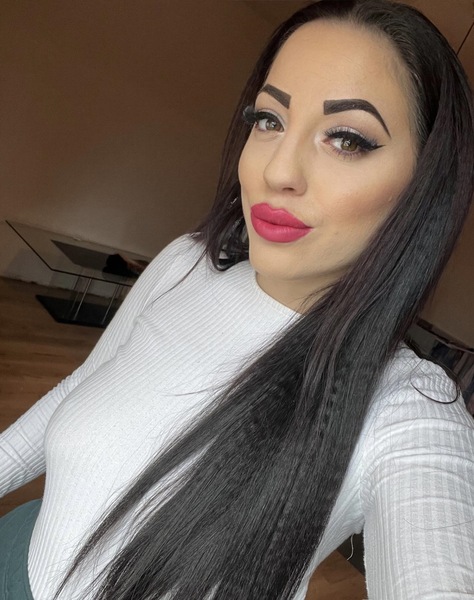| Haare: | brünett, schulterlang, wellig |